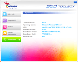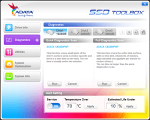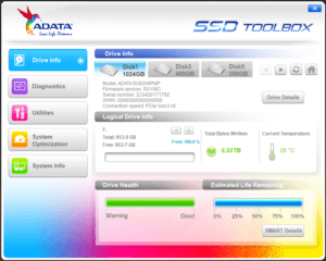 ADATA SX8200 Pro disku pārraudzībai piedāvā SSD ToolBox programmu, kas spēj attēlot diska informāciju, veikt vienkāršu diagnostiku, atjaunināt aparātprogrammatūru (firmware), kā arī droši nodzēst diska saturu. Tāpat pieejama sadaļa sistēmas optimizēšanai. Plašāk par tās funkcionalitāti var spriest pēc pievienotajiem attēliem. Katrā ziņā vizuāli tā ir pievilcīgāka par Patriot PCIe Toolbox, bet līdz Samsung Magician funkcionalitātes līmenim vēl ir kur augt.