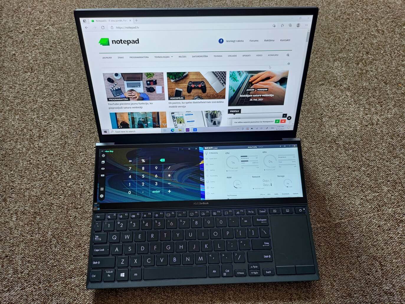 Būtisku uzlabojumu saņēmis papildus displejs – ZenBook Duo ir aprīkots ar noliekamo ScreenPad Plus displeju. Tas, atverot klēpjdatoru, automātiski paceļas par vairākiem grādiem, kas tādējādi samazina displeja atspīdumus un ir ērtāk pārskatāms. Izmantojot ErgoLift viras mehānismu un ScreenPad Plus displeja pacelšanu, tiek uzlabota arī klēpjdatora dzesēšana. Uzreiz pieminēšu, ka dzesēšanas risinājums, manuprāt, ir nedaudz nepārdomāts. Gaisa atveres ir novietotas tā, ka siltais gaiss tiek pūsts uz galvenā displeja apakšdaļu.