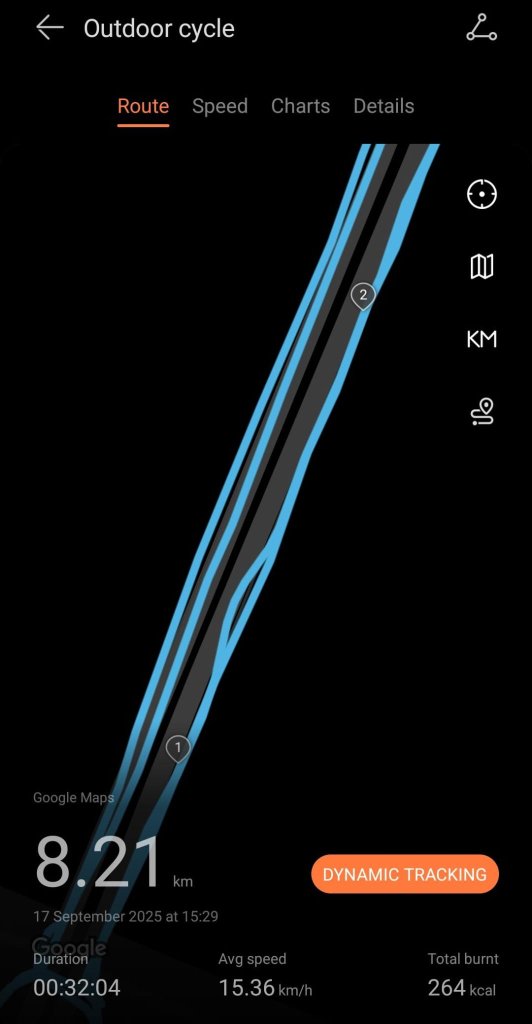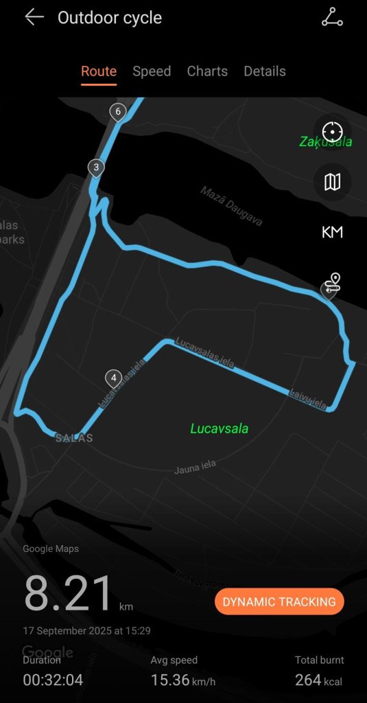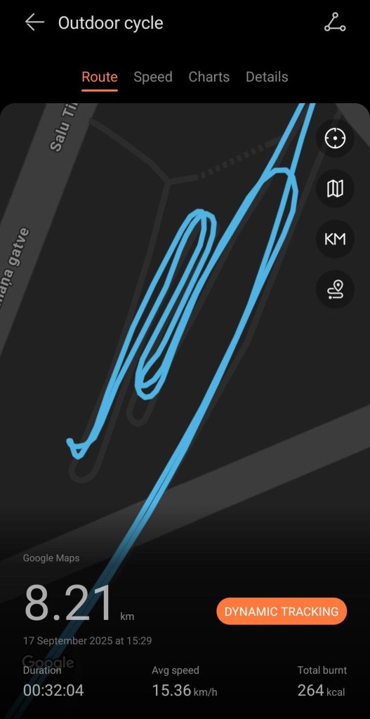 Kā jau ierasts, braucot ar velosipēdu, aizmirsu ieslēgt sporta režīmu, bet pulkstenis mani pieķēra – pat bez manuālas ieslēgšanas tas atšķir, vai vienkārši pastaigājos vai minu pedāļus. Šķiet, pulkstenis mani pazīst labāk nekā es pats… varbūt nākamreiz atgādinās arī par ķiveri.