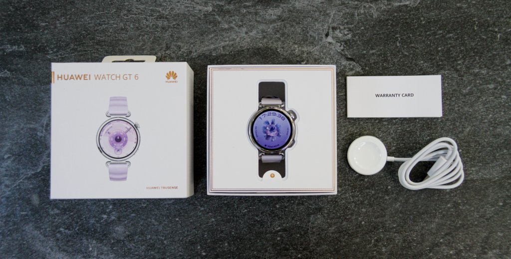 Sākot jau no iepakojuma un kastītes – dizains palicis nemainīgi glīts. Iekārta ir paslēpta ierastajā baltajā kastītē, ko rotā zelta elementi. Atverot kastīti sagaida jaunais un elegantais Huawei Watch GT 6 (uz apskatu saņēmām 41 mm versiju ar violetu silikona siksniņu), bet aiz tā paslēpta garantijas karte un uzlādes vads.