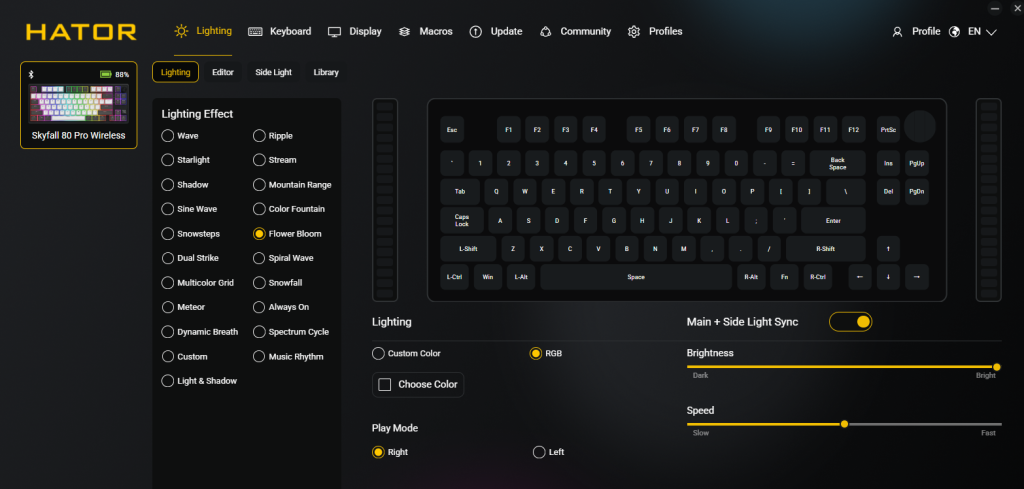 Ja vēlaties pielāgot iekārtu savām vēlmēm, būs nepieciešams apmeklēt HATOR mājaslapu un lejupielādēt SyncHub lietotni. Ja lietotnes datorā nedaudz par daudz, pieejama arī funkcijām nabagāka lietotnes web versija. Vairums lietotāju visticamāk vismaz uz bītiņu iestrēgs lietotnes pirmajā sadaļā, kas atbild par iekārtas RGB krāsu spēlēm. Te varēs iestatīt statiskus vai kustīgus gaismu profilus vai veidot savus režīmus. Pielāgot var ne tikai taustiņus, bet arī malās esošās gaismu līnijas. Iespējams arī individuāli izcelt tikai dažus, sevis izvēlētus taustiņus, piemēram, visai tastatūrai iestatīt baltu apgaismojumu, bet WASD taustiņiem – krāsainu.