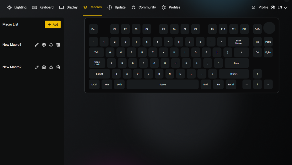 Display sadaļā iespējams pielāgot TFT ekrāna dizainu, piemēram, uzzīmēt kaut ko individuālu. Macros sadaļā iespējams jau spert soli tālāk un daudz padziļinātāk pielāgot dažādus tasutiņus ar makrosiem. Šī sadaļa gan ir gana sarežģīta un priecātos šeit redzēt vairāk skaidrojumus.