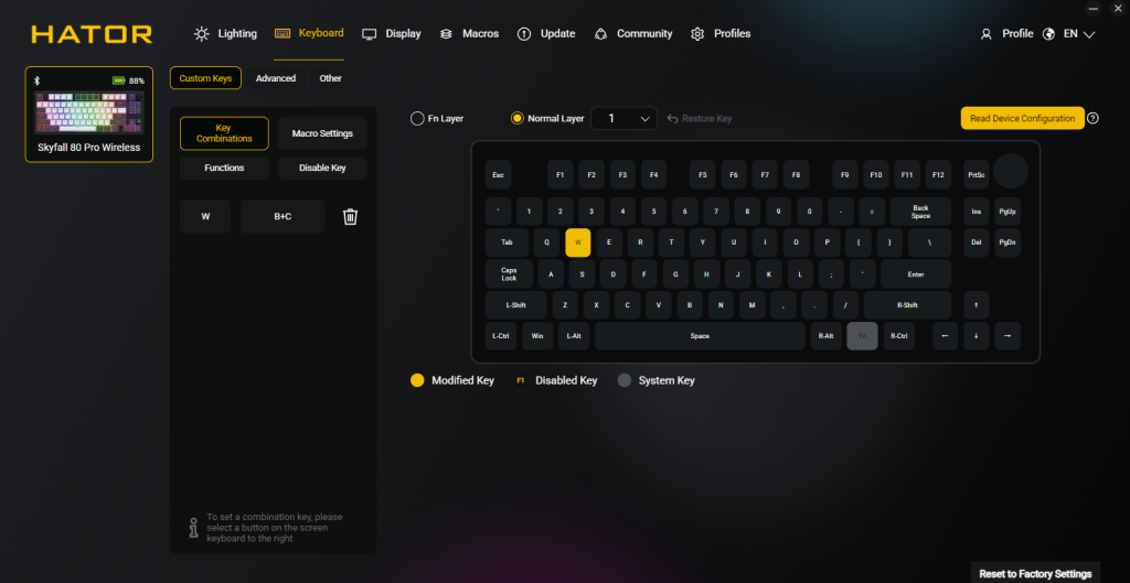 No funkciju viedokļa Skyfall 80 Pro Wireless patīkami pārsteidz ar savu daudzpusību. Tastatūra atbalsta vadu savienojumu, 2.4 GHz bezvadu režīmu un Bluetooth, kas praksē nozīmē, ka tā bez kaprīzēm sadarbojas gan ar stacionāro, gan ar portatīvo datoru, gan planšeti vai pat telefonu. Pārslēgšanās starp ierīcēm ir ātra un saprotama, bez vajadzības katru reizi pāršķirstīt lietošanas instrukciju.