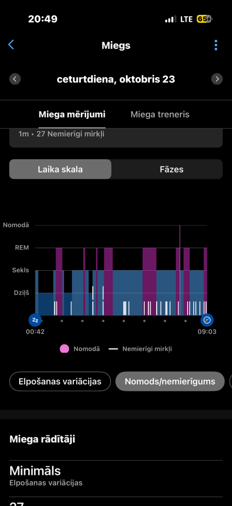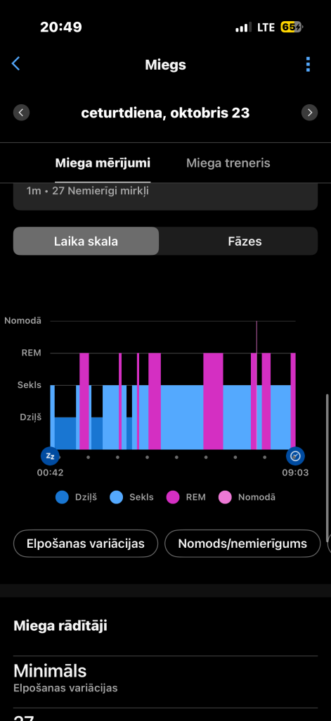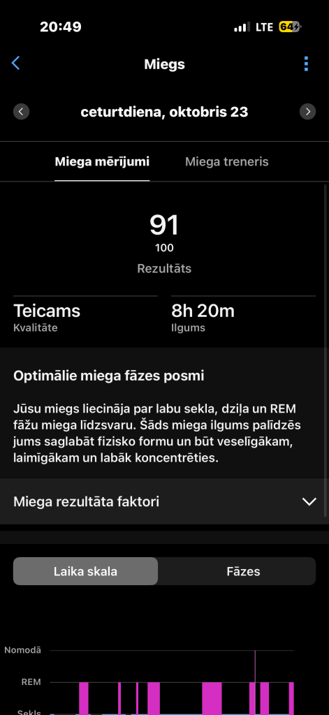 Atgriežoties pie mērījumiem. Sadaļā “Miega mērījumi” saņemsiet sava miega “vērtējumu” – rezultāta, kvalitātes un ilguma mērījumus. Pēcāk seko miega fāzes posmu raksturojums, kur ātri iepazinos ar komentāriem par pavadīto nakts mieru.