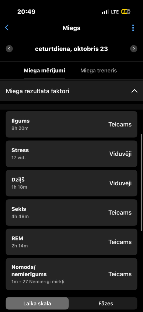 Pēcāk seko “Miega rezultāta faktori”. Šeit atkal parādās miega ilgums, stresa līmenis, dziļa, sekla un REM miega rādītāji, kā arī tas, cik ilgi miegs ir bijis nemierīgs vai arī esat bijis nomodā.