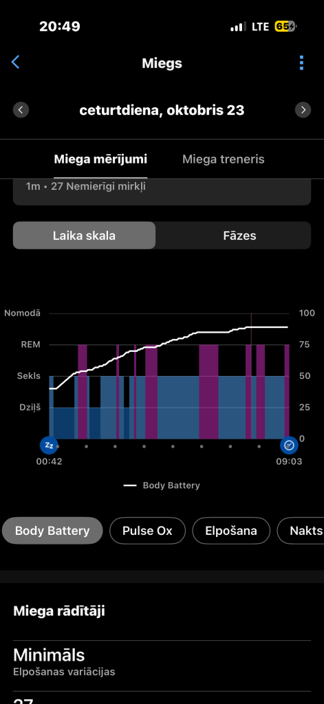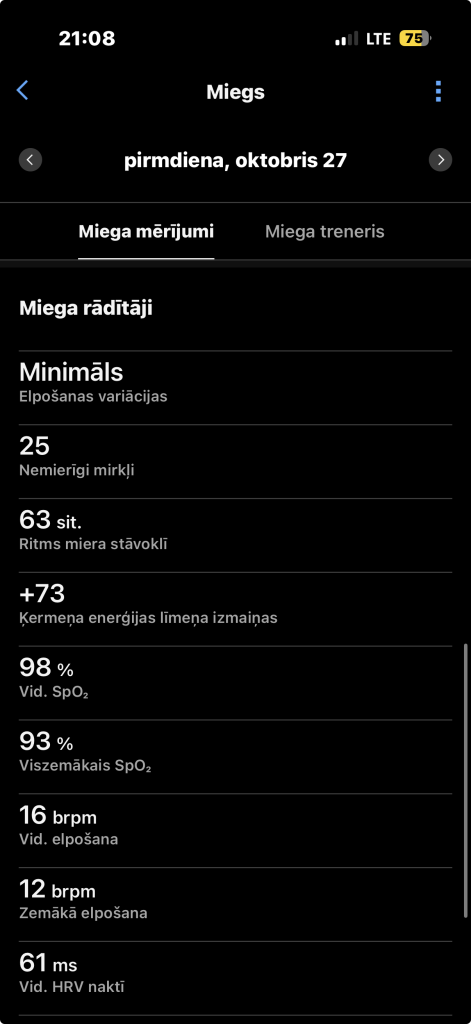 Uzreiz pēc pamošanās ķēros pie miega datu analīzes. Ieejot lietotnē un uzspiežot uz attiecīgās dienas mērījumiem, ir iespēja piekļūt uzskatāmiem miega mērījumiem.