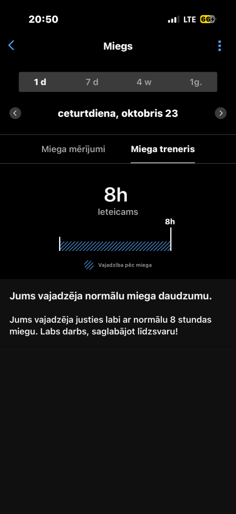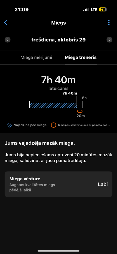 Pie regulāras ierīces izmantošanas varēju piekļūt arī miega trenerim. Šeit varēju iepazīties ar to, cik liela nepieciešamība pēc miega ir bijusi iepriekšējā naktī. Tāpat interesanti, ka ierīce spēja nolasīt, ka man ir bijis nepieciešams mazāk miega nekā iepriekš pilnīgam ķermeņa atjaunošanās procesam, turklāt jāsaka, ka šis rādītājs bija gana precīzs.