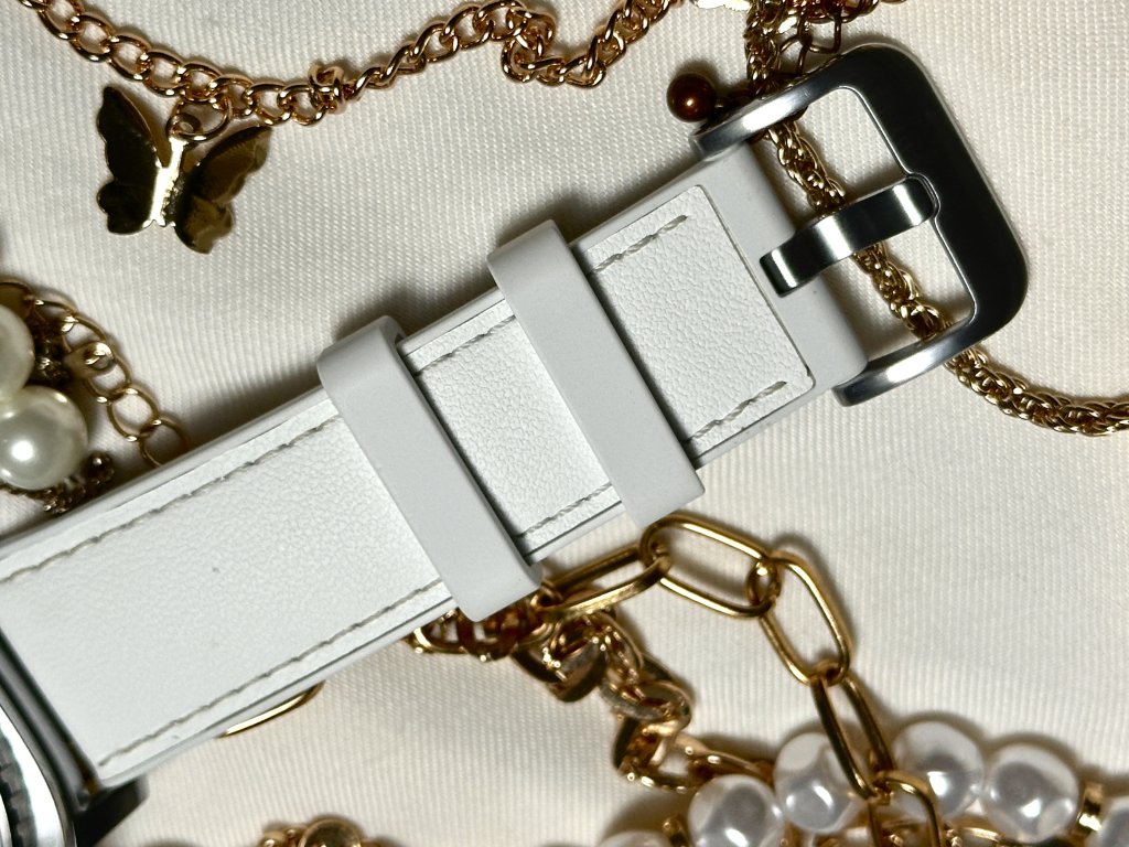 Virzoties tālāk, kastē atrodama hibrīda siksniņa, kuras tonis ir pieskaņots ierīcei – baltā krāsā. Tās virspusi klāj ādas tipa materiāls, bet iekšpuse ir no gumijas, lai nodrošinātu ērtumu un izturību ikdienas lietošanā. Visu kopā satur metāla sprādze un stiprinājuma vietas. Siksniņa pieejama tikai vienā izmērā – 20 mm. Internetā gan atrodamas dažas sūdzības par tās izmēru, taču man kā smalku roku īpašniecei tas problēmas nesagādāja.