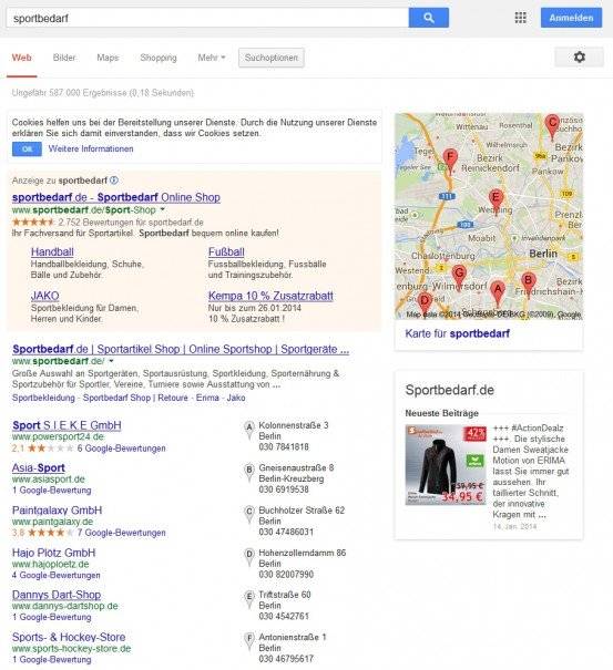 1. attēls: ievadot meklētājā “Sportbedarf” (Vācijas sporta preču veikalu tīkls), redzama viena vienīga reklāma. Jo par to ir samaksāts.