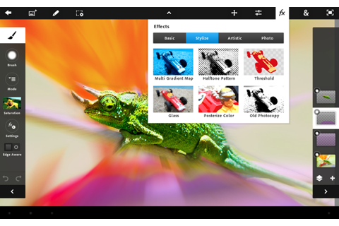 Bāzes programma Photoshop Touch pilda galvenās Photoshop funkcijas. Tanī var apvienot bildes, strādāt ar slāņiem, rediģēt attēlus, pievienot efektus. Scribble Selection Tool dod iespēju atdalīt nevajadzīgos elementus no vajadzīgajiem. Refine Edge ļauj atdalīt sarežģītus attēla elementus ar negludām malām.