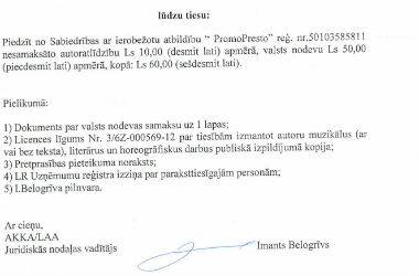 Kā rāda šis pretprasības pieteikums, pagājušā gada 31. oktobrī starp SIA PromoPresto un AKKA/LAA noslēgts licences līgums par tiesībām “izmantot autoru muzikālus (ar vai bez teksta), literārus un horeogrāfiskus darbus publiskā izpildījumā”.