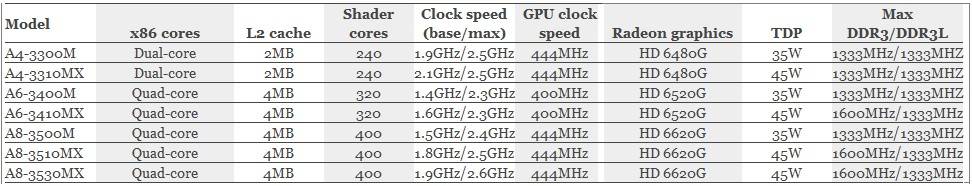Kombinētie procesori galvenokārt domāti plaša patēriņa (mainstream) klēpjdatoriem un galda PC. Visiem modeļiem ir AMD Turbo Core pēc analoģijas ar Intel Turbo Boost – funkcija regulē taktsfrekvenci atkarībā no noslodzes. Grafiskās subsistēmas atkarībā no modeļa ir trīs: Radeon HD 6480G, 6520G un 6620G. To parametrus AMD Turbo Core neizmaina. Visas subsistēmas atbalsta DirectX 11, OpenGL, 3D un Full HD, interfeisus HDMI un DisplayPort ar iespēju pieslēgt vairākus monitorus. Neiztrūkst arī USB 3.0 atbalsts.
