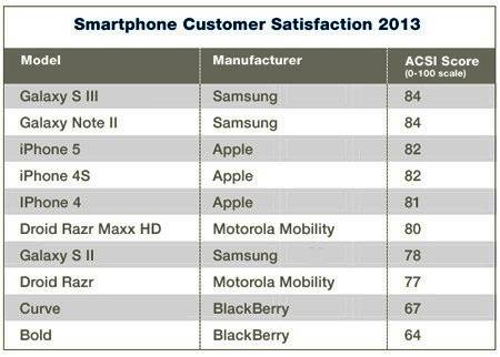 Pēc ACSI veikto ASV pilsoņu aptauju datiem Android ierīces Samsung Galaxy S3 un Galaxy Note 2 izpelnījušās vislielāko pircēju atzinību un novērtētas ar 84 punktiem. Ar 82 punktiem seko iPhone 5 un iPhone 4S. Respondentiem bija jāatbild uz jautājumiem: