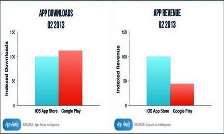 Savukārt lejuplāžu skaits no Google Play 2013. gada 2. ceturksnī par 10% pārsniedzis līdzšinējā rekordista Apple App Store rādītājus. Protams, ka 1. vietā abos veikalos ir ASV patērētāji. Savukārt ienākumu ziņā App Store joprojām ir priekšā par 230% – Android lietotāji nevēlas maksāt naudu par programmatūru.
