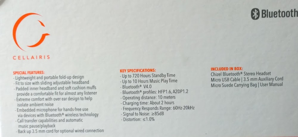 Tad nu tā, Cellairis Chizel Bluetooth austiņas ir iepakotas pabiezā kartona kastē. Komplektā ietilpst USB vads uzlādēšanai un austiņu vads ar ko iztikt brīžos, kad akumulatora baterija ir iztukšojusies. Vēl – uz tausti samtains sintētiska materiāla maciņš un neliels buklets ar īsu pamācību pāris populārākajās pasaules valodās (latviešu un krievu, protams nav).