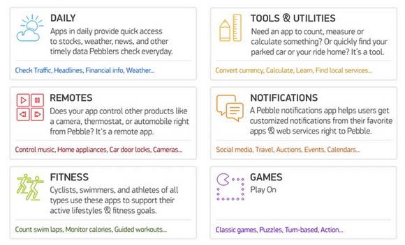 Prezentēja arī Pebble AppStore, kaut arī tur vēl viss nav pilnībā gatavs. Katrā ziņā lietotņu viedpulksteņiem pietikšot. Darbojas arī izstrādātāju zona, kur pieejamas šādas lietotņu kategorijas: