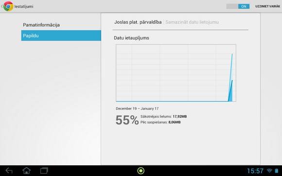 Lai ieslēgtu mobilo datu kompresiju, jāiet Chrome Iestatījumos> Papildu> Joslas platuma pārvaldība> Samazināt datu lietojumu.