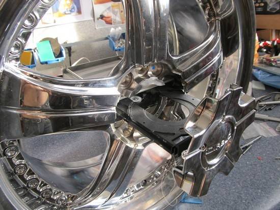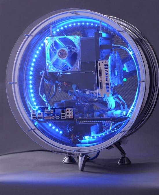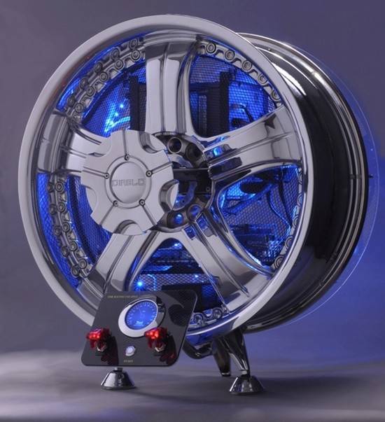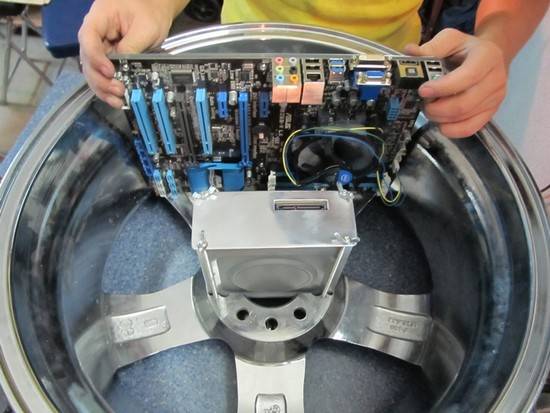 Datoriķu fantāzija ir nebeidzama: tie, kuriem taisnas rokas – pamanās iebūvēt savus dzelžus praktiski jebkurā korpusā. Bet šādu, automobiļa lietajā riteņa diskā montētu, redzu pirmoreiz. Bāze – lietais disks “Diablo 18″ Chrome”. Protams, katram šāds darbiņš nebūs pa spēkam neatkarīgi no roku leņķa. Te vajadzīgs arī nopietns metālapstrādes aprīkojums frēzēšanai. Š ajā gadījumā nemaz nebija darbs pašu priekam, bet gan kāda naudasmaisa -“jaunā krieva” pasūtījums.