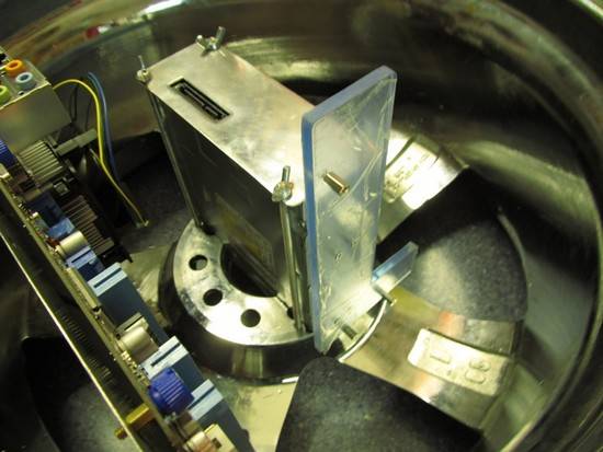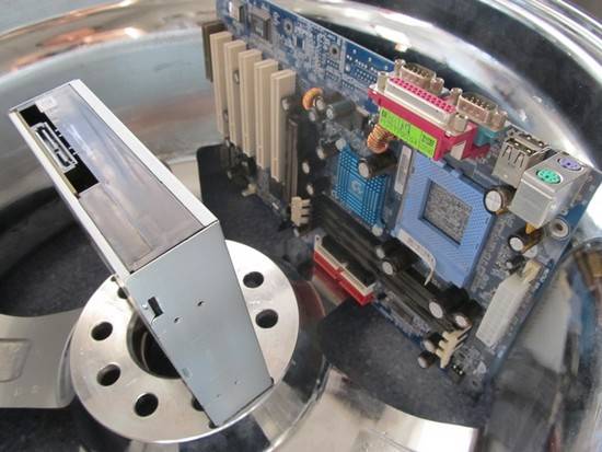 Visoriģinālākais risinājums, manuprāt, pielietots DVD rakstītājam (to vislabāk redz beigās uz video). Pats grūtākais bija diskā iemānīt pilnizmēra mātesplati ATX (305×244), jo lietot ievērojami mazāko FlexATX (229×191) pasūtītājs nepiekrita.