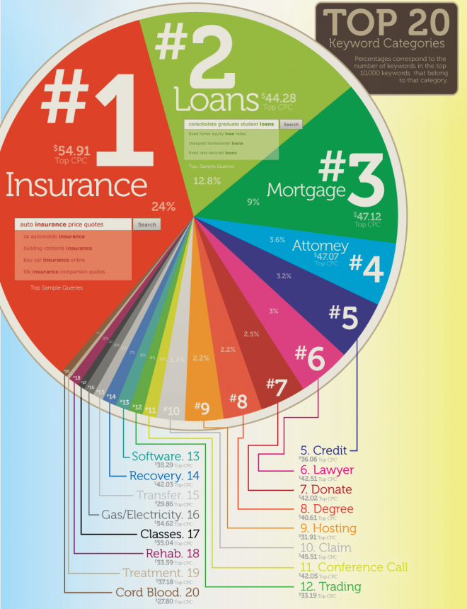 Pirmajā vietā ir “Insurance” jeb apdrošināšana. Kad kāds klikšķina uz reklāmu ar šo atslēgvārdu, reklāmdevējam ir jānoskaita vidēji 54 USD, no kuriem 24% saņem Google. Otrajā vietā ir “Loans” jeb kredīti – tā maksā 44 USD klikšķis; Google saņem 12,8%.