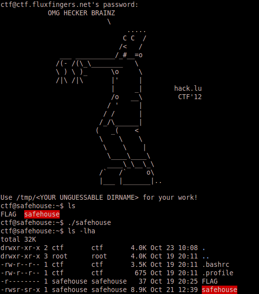 Zombies do not only tend to eat brains, they also tend to write unsecure code! Looks like they don’t even know how to use stringcopy functions correctly, so there should be no problem for you to exploit this most simple of all bugs, right? SSH: ctf.fluxfingers.net PORT: 2091 USER: ctf PASS: xxxxxxxxxxxxx