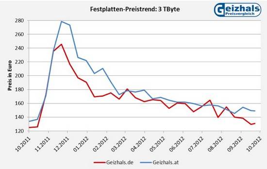 Grafikā uzskatāmi redzam Western Digital 3,5″ 3 TB HDD cenu izmaiņas. Š obrīd Vācijas veikalos tāds maksā, sākot ar 125 €. Latvijā lētākā cena fiksēta 100.00 Ls apmērā.