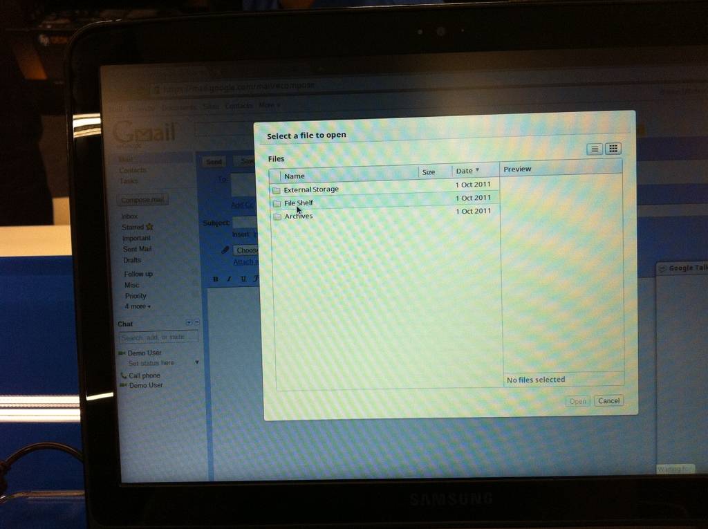 Failus uz hrombuka glabāt var. Tam paredzētas noklusējuma mapes. Failus var pievienot vēstulēm kā pielikumus, bet kaut ko darīt var tikai ar dažiem tipiem, piem. bildēm vai video. Arī tad viss jādara “mākonī”, piem. WebPicasa. Visas lejupielādes nonāk noklusētajās mapēs.