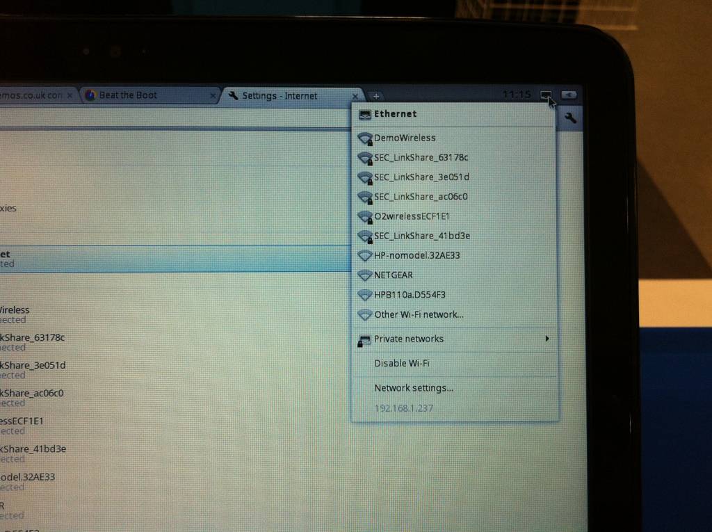 Tālāk hrombuks tika ieslēgts. Ielāde prasīja tikai 8 sekundes. Pēc tam jautāja pēc Google konta lietotājvārda un paroles (tika izmantots “demo”), un parādījās Google Chrome pārlūka logs, kurā redzamas preinstalētās web aplikācijas. Chrome logu aizvākt nevar nekādi, var tikai atvērt dažāda satura tabus.