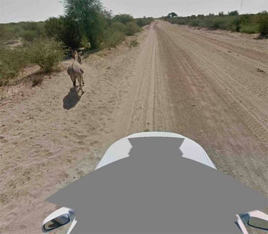 Pēdējā kadrā ēzelītis izbrīnīts skatās pakaļ guglmobīlim… skaidrs, ka viņš palicis dzīvs. Bet StreetView kadrā bildes salīmējušās tādā veidā