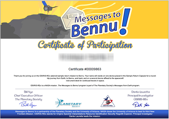 Ja tomēr māc šaubas, vai ciplanētieši ieraudzīs Tavu mikroskopisko vārdu, tas noteikti saņems grandiozu bezmaksas ekskursiju! Kosmosa aparāts ap asteroīdu riņķos 500 dienas, pirms dosies atpakaļ uz Zemi. Un gan ceļojošais kosmosa kuģis, gan tā paraugu kapsulas nesīs Tavu vārdu. Tu vari piereģistrēties jau šodien un pilnīgi par brīvuPlanitery Society