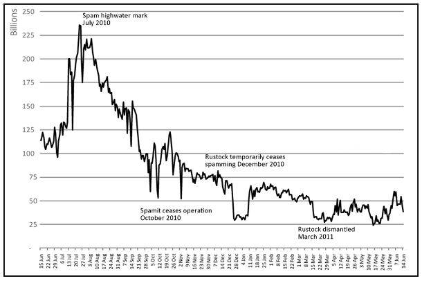 Kāpēc tik radikāls kritums? Speciālisti uzskata, ka tam par iemeslu bija pilnīga vai daļēja botnet tīkla Rustock iznīcināšana. Uz šī tīkla sirdsapziņas atradās ap 40% no vispasaules spama jūras. Tiktāl priecīgā ziņa.