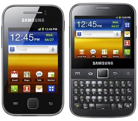 Otrie 2 modeļi vizuāli līdzinās minētajiem, bet ir vienkāršāki un ietilpst budžeta klasē. Galaxy Y apgādāts ar 3,2″ displeju, bet Y Pro – 2,6″, abu izšķirtspēja 320×240. Arī procesori ir vājāki – 832 MHz, kameras 2 MPix. Baterija – 1200 mAh.