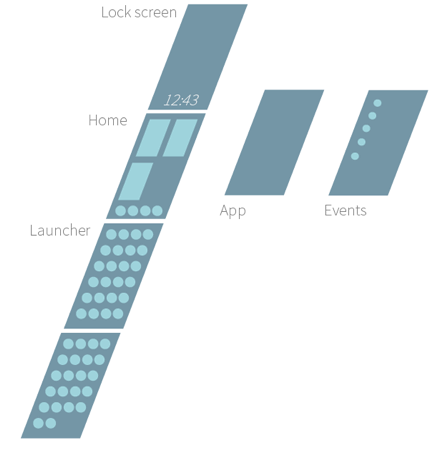 Toties programmatūras daļa jau ir visai interesanta. Pirmkārt, nebūs problēmu ar programmām – Android lietotnes darbosies. Lietotāja saskarnei nebūs nekādu pogu – viss notiks tikai ar žestiem (apakšējais attēls). Lietotājam nodrošināta vizuālā, taktilā un skaņas atgriezeniskā saite. Arī visi ekrāni (bloķēšanas, starta, launcher