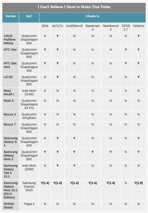 Kā izdibinājis 9to5Google.com, Samsung, LG, HTC un citi lielrūpnieki pieķerti savu viedtālruņu testu viltošanā ar mērķi uzrādīt labākus veiktspējas rezultātus nekā konkurentiem. Kā godīgus ražotājus minēja Motorola, Google un Apple, kuri ar tādu praksi nenodarbojas. Lietotāju mānīšana notiek visaugstākajā līmenī, ieskaitot iebūvētus manipulācijas instrumentus.