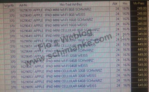 Kā redzam, pavisam būs 16 iPad Mini variantu (ieskaitot krāsu). Paši lētākie ar 8 GB atmiņu un bez 3G maksās 249 €. Savukārt dārgākā versija ar 64 GB atmiņas un Wi-Fi + 3G maksās 649 eiro.