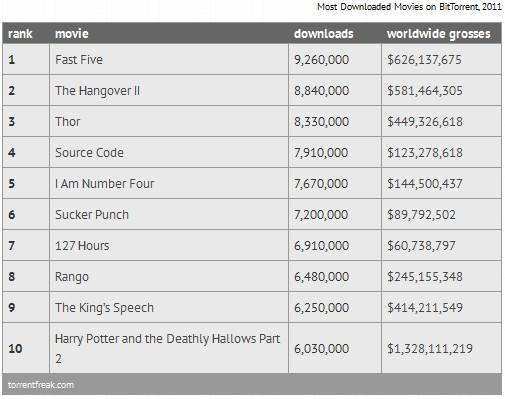 Filmu un seriālu vidū “spēku samērs” pasaulē ir mazliet citāds kā Latvijā. Bet par gaumēm jau nestrīdas. No statistikas var izdarīt interesantus secinājumus, ka ne vienmēr filmas budžets un kases ieņēmumi ir noteicošais nelegālo lejuplādētājuFast Five127 Hours