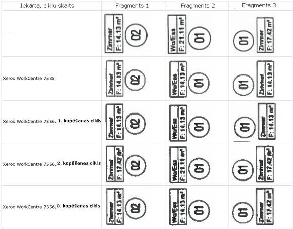 Defekts pamanīts uz mašīnām Xerox WorkCentre 7535 un Xerox WorkCentre 7556 un attiecas galvenokārt uz maza izmēra cipariem.