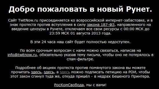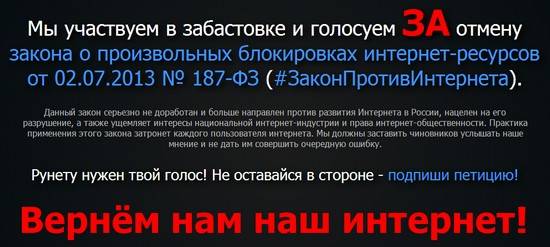 Krievijā šodien sākušās masveida akcijas un parakstu vākšana pret jauno likumu; daudzās vietnē pasludināts 24 stundu streiks un redzami šādi logi: