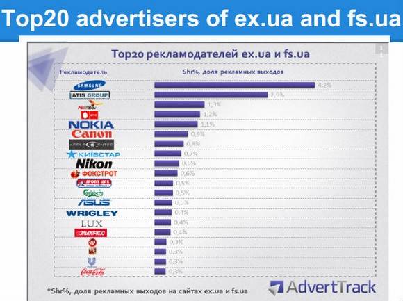 NVS valstīs ļoti populāras ir failapmaiņas vietnes EX.ua un FS.to (agrāk fs.ua), tām ir miljonos mērāms apmeklējums. Atbilstoši pētījumam, pasaulē pazīstami zīmoli nodrošina ap 10% no šo lapu finansējuma, pie tam 4.2% – Samsung viens pats. No IT segmenta reklāmdevēju sarakstā vēl ir arī Nokia, Canon, Nikon un ASUS. Atklājies arī, ka minētajās divās failapmaiņas vietnēs atrodams 15% no reklāmu kopskaita, ko Samsung izvietojis Ukrainā.