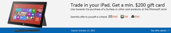 Lai palīdzētu cilvēkiem ātrāk izšķirties par draņķīgo planšetu iPad nomaiņu pret kolosālajām Surface RT un Pro, Microsoft savos firmas veikalos uzsācis akciju. Katrs, kurš atnesīs lietotu iPad 2, 3 vai 4, saņems dāvanu karti “vismaz 200 USD apmērā” Windows planšetdatoru vai citu vērtīgu Microsoft preču iegādei. Microsoft Store tīklā pārdod arī Nokia Lumia viedtālruņus un dažādus aksesuārus.
