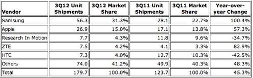 Arī parasto “zvanāmo” tālruņu segmentā Nokia vairs nav līderis – pēdējā atskaites ceturksnī saražots 82,9 miljoni vienību pret Samsung 105,4 miljoniem. Interesants ir Samsung fenomens – 12 mēnešu laikā pārdoto viedtālruņu skaits ir vairāk nekā dubultojies. Kopā ar Apple dienvidkorejieši ieņem gandrīz pusi pasaules tirgus.
