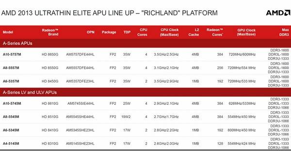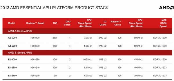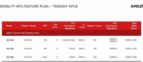 Jaunā APU līnija dalās trijās cenu kategorijās: 2013 AMD Elite Mobility Platform (Temash), 2013 AMD Mainstream APU Platform (Kabini) un 2013 Elite Performance APU Platform (Richland). Vislētākie – Temash – ir iespējās apgraizīti Kabini procesori ar mazāku izdalītā siltuma daudzumu. Tas nozīmē, ka APU ir zemāka taktsfrekvence, un šie 28 nm tehnoloģijas čipi paredzēti sākumlīmeņa ierīcēm. Grupā ietilpst čipi A6-1450, A4-1250 и A4-1200, no kuriem pirmais ir 4-kodolu, bet pārējie divkodolu. TDP=8 W un 3,9 W attiecīgi.