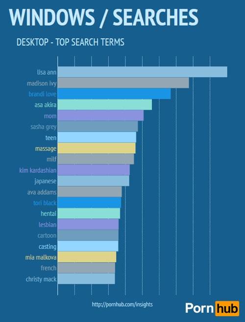 Visvairāk porno skatās ar Windows 7, tad nāk XP un Windows 8. Zīmīgi, ka PornHub ik mēnesi apmeklē vairāki tūkstoši seksa dinozauru ar tādām aizvēsturiskām OS kā Windows NT, 2000, Me.