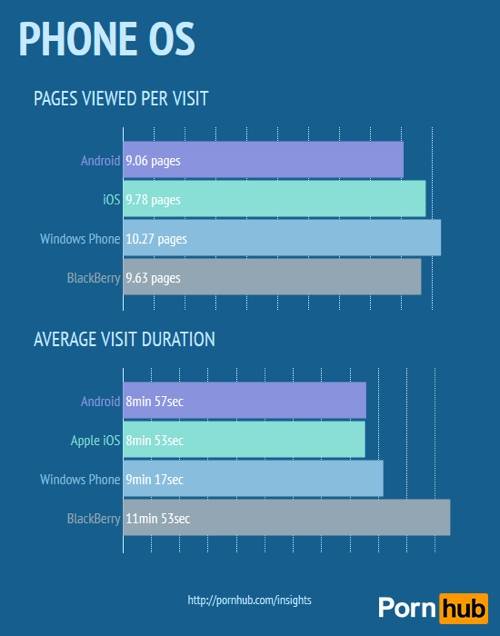 Mobilo ierīču vidū dominē, protams, Android ar 50% pornotrafika. Nākamie ir Apple iOS ar 40.6%. Tā kā iOS ierīču ir ievērojami mazāk nekā zaļo Andru, visiem kļūst skaidrs, kuri te ir izvirtuļi :). Tādas platformas kā WP8, Blackberry, Bada aizņem vien 1-2% pornotrafika. Zīmīgi, ka vadītāju un menedžeru iecienītais BlackBerry pornolapā sēdējis visilgāk: katra sesija ilgusi vidēji 12 minūtes. Android lietotāji beiguši vidēji par 4 minūtēm ātrāk.