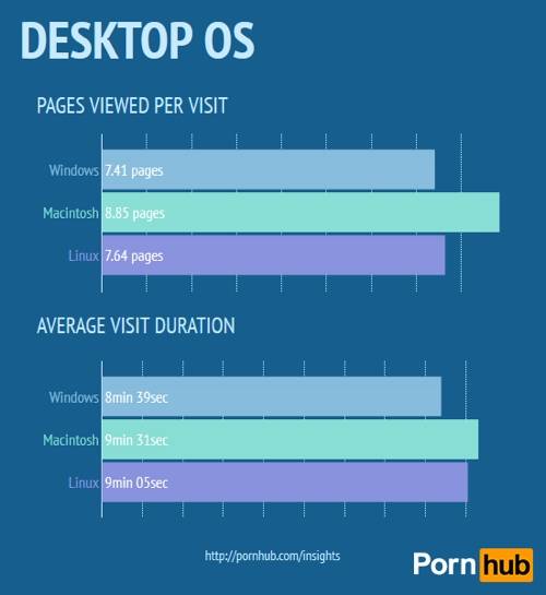 Izrādās, ka uz mielošanos ar virtuālo seksiņu viskārākie ir Apple lietotāji. Mac platforma aizņem 6.6% tirgus, kamēr viņi patērē 10.9% kopējā pornotrafika. Windows daļa ir 90%, bet patērē vien 85.5% trafika. “Pingvīnu” seksuālās tieksmes ir visprognozējamās: 1.7% Linux lietotāju patērē tieši tikpat daudz pornotrafika.