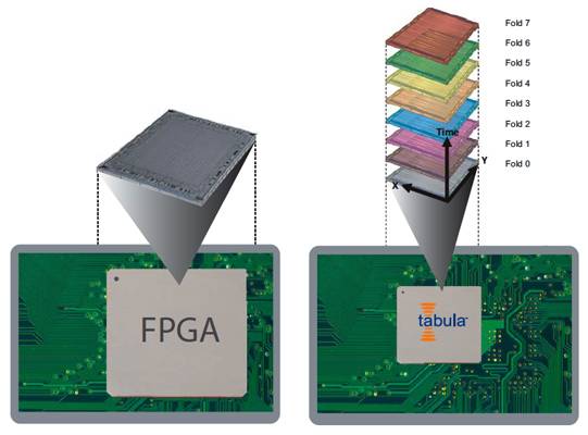 Kompānijas Tabula ABAX mikroshēmu līnijā ievērojamā mērā izdevies novērst klasiskos trūkumus. ABAX čipos signālu izlaiž caur secīgiem 8 blokiem, no kuriem katrā ir izveidota sava shēma. Ar šādu pieeju izdevies sasniegt 1,6 GHz taktsfrekvenci. Lai saprastu šo čipu revolucionāro ideju, atkal pievērsīsimies primitīvismam: iedomāsimies, ka vienu mikrosekundi mūsu mikroshēma izpilda CPU pienākumus, nākamo mikrosekundi tā top pārprogrammēta par videokarti, nākamo – par tīkla karti utt. Laikā, kamēr notiek pārprogrammēšana, datus saglabā kešatmiņā. Mājaslapā ir video