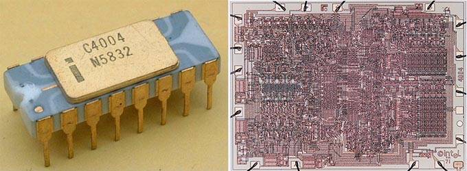 Izgudrojuma vēsture ir šāda: kompānija Busicom pasūtīja Intel 12 mikroshēmas savam jaunajam kalkulatoram. Inženieriem tas likās neloģiski, un viņi sadomāja tās apvienot vienā korpusā. Tieši tobrīd radās MOS Silicon Gate tehnoloģija, kas arī deva iespēja pa jaunam pieiet mikroshēmu projektēšanai.