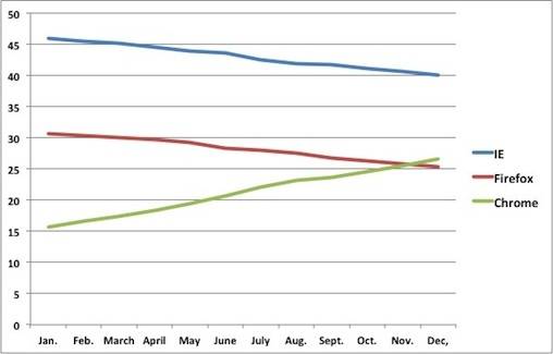 Ja mēs domās paturpinām attēlā redzamo līkni, un nekas nemainīsies, var pat cerēt, ka 2012. gada otrajā pusē Chrome apsteigs arī Internet Explorer un kļūs par pasaules līderi. Pēdējam gan personiski es neticu, jo šo procesu bremzē daudzskaitlīgo korporatīvo datorsistēmu sisadmini, kuri ir par slinku, lai darba datoriem bez noklusētā IE instalētu vēl papildus pārlūkprogrammas.