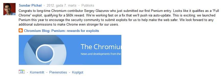 Hakerim no Krievijas Sergejam Glazunovam izdevās būt pirmajam, kas uzlauza Google Chrome ar visu tanī iebūvēto sandbox