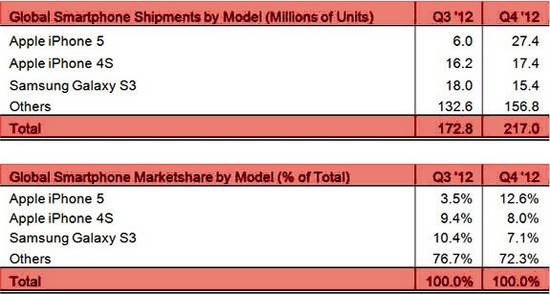 Joprojām ļoti sekmīgi norit arī Apple iPhone 4S tirdzniecība – tā tirgus daļa sastāda 8%. Toties Samsung negatavojas atzīt sakāvi: jau martā-aprīlī sagaidāms jauns flagmanis Galaxy S4 ar vēl pamatīgākiem muskuļiem